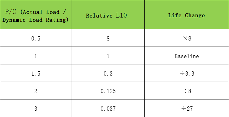 Erhöhte Belastung → höhere Hertzsche Kontaktbelastung zwischen Wälzkörpern und Laufbahnen → höhere zyklische Belastung in den Materialoberflächenschichten → beschleunigte Entstehung und Ausbreitung von Ermüdungsrissen → vorzeitiges Pitting und Abplatzungen. Die maximale Wälzkörperbelastung bestimmt die Lebensdauer; unter hoher Belastung verursacht die ungleichmäßige Lastverteilung lokale Belastungen, die den Durchschnitt bei weitem übersteigen und zum Lebensdauerengpass werden.