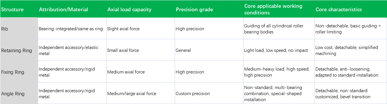 Borden, Sicherungsringe, Befestigungsringe und Winkelringe von Zylinderrollenlagern sind wichtige Zubehörteile/Konstruktionselemente für die axiale Positionierung/Begrenzung, die Führung von Wälzkörpern und die Sicherung von Lagerkomponenten. Ihre Kernfunktionen konzentrieren sich auf die axiale Begrenzung, die Führung von Wälzkörpern, die Befestigung von Lagerkomponenten und die Anpassung an die Arbeitsbedingungen bei der Montage. Die vier Arten von Strukturen unterscheiden sich erheblich in ihrer Konstruktionsposition, ihren Anwendungsbereichen und ihren spezifischen Funktionen. Einige sind integrierte Strukturen von Lagern, während andere als Einbauzubehör erworben werden. Ihre Kernfunktionen und Anwendungsmerkmale werden im Folgenden ausführlich beschrieben, kombiniert mit praktischen technischen Anwendungsszenarien: