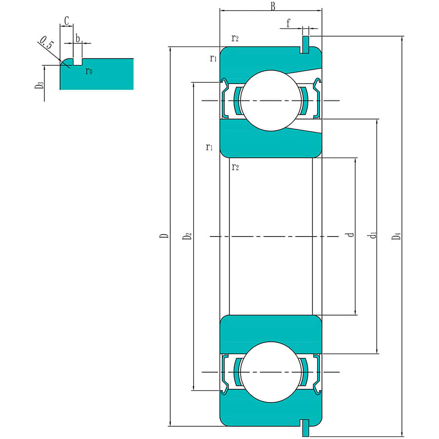 - -2ZNR = Ringnut und Sprengring im Außenring, Deckscheibe auf beiden Seiten