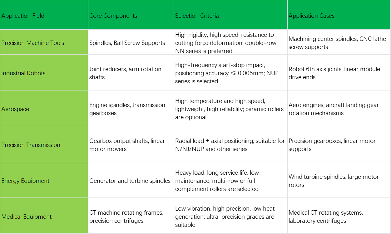 1. Reine radiale Schwerlast + hohe Drehzahl: Wählen Sie einreihige Präzisions-Zylinderrollenlager der Serien N/NU, wobei Sie sich auf das Käfigmaterial und die Schmierstoffabstimmung konzentrieren sollten.